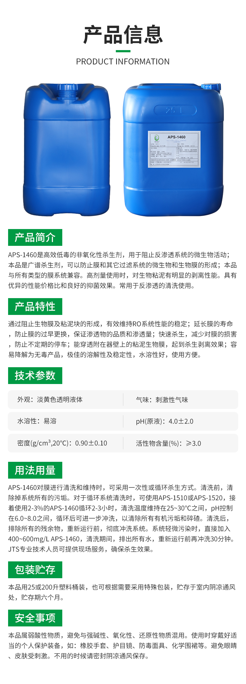 APS-1460對膜進行清洗和維持時,可采用一次性或循環殺生方式。清洗前,清理掉系統所有的污垢。對于循環系統清洗時,可使用APS-1510或APS-1520,接著使用2-3%的APS-1460循環2-3小時,清洗溫度維持在25~30℃之間,pH控制在6.0~8.0之間,循環后可進一步沖洗,以清理所有有機污垢和碎碴。清洗后,排除所有的殘余物,重新運行前,徹底沖洗系統。系統輕微污染時,直接加入400~600 mg/L APS-1460,清洗期間,排出所有水,重新運行前再沖洗30分鐘。JTS專業技術人員可提供現場服務,確保出色的殺生效果。