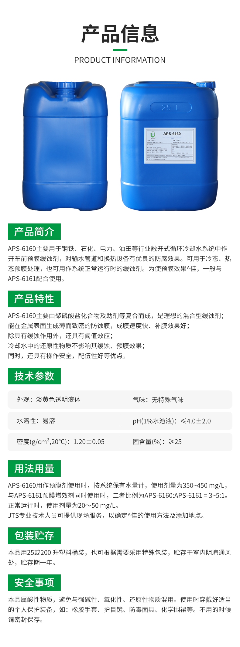 APS-6160用作預膜劑使用時,按系統保有水量計,使用劑量為350~450 mg/L,與APS-6161預膜增效劑同時使用時,二者比例為APS-6160:APS-6161 = 3~5:1。正常運行時,使用劑量為20~50 mg/L。