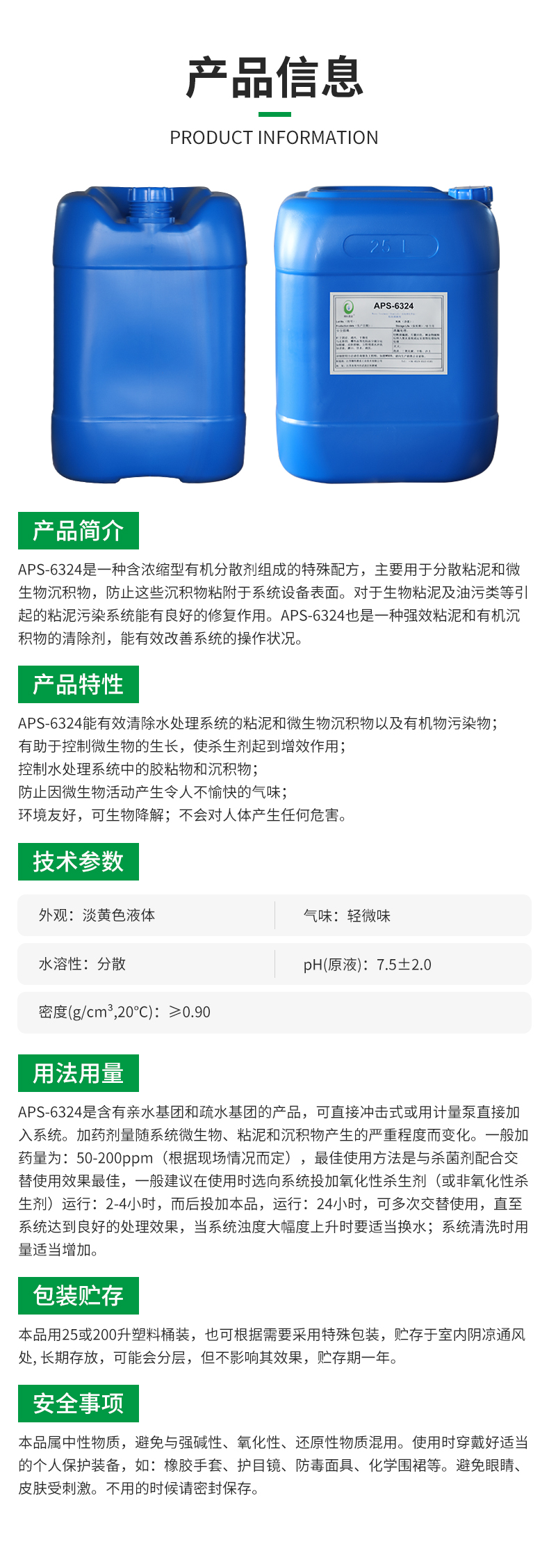 APS-6324是含有親水基團和疏水基團的產品,可直接沖擊式或用計量泵直接加入系統。